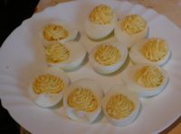 Z vajíčok vyberieme žĺtky. Pridáme maslo, horčicu, jogurt, Vegetu a dve bielka. Všetko rozmixujeme. Čajovou lyžičkou naporcujeme do rozpolených bielkov.