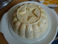 4 vaječné žĺtky uvarené na tvrdo, 330 g sterilizovaného hrášku s mrkvou, 200 g majonézy, 2 sladkokyslé uhorky, 2 polievkové lyžice z uhorkovej vody, silná želatina na 500 ml tekutiny, soľ, mleté biele korenie