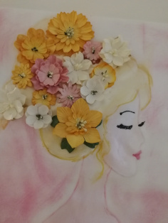 Na plátno nakreslíme portrét ženy, dievčaťa. Môžeme žiakom pripraviť šablónu, ktorú obkreslia pomocou tenkého okrúhleho štetca temperovými farbami a následne vyfarbia vodovými farbami. Pomocou lepidla dodekorujeme portrét vylisovanými kvetmi alebo látkovými kvetmi.