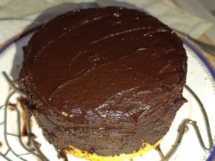 Po vytiahnutí z rúry necháme vychladnúť. Vyklopíme a nakrájame na tri časti. Potrieme pomarančovou marmeládou, poskladáme späť a polejeme polevou z horkej čokolády.