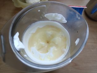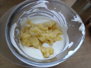 Šľahačku vyšľaháme do tuha. Následne vmiešame Piknik a poňom rozpučený banán vidličkou.