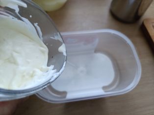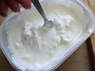 Vlejeme do nádobky, ktorá môže ísť do mrazničky. Vložíme do chladničky na dve hodiny na miesto, kde chladnička najviac chladí. Potom vyberieme a vidličkou premiešame. Následne vložíme do mrazničky na asi dve hodiny. Potom zase vyberieme a premiešame a už necháme zmraziť asi štyri hodiny.