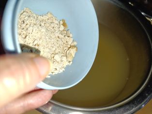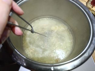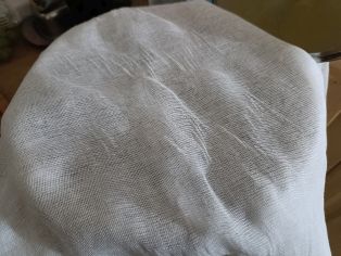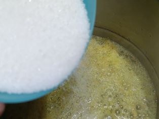 Pridáme 150 g krupicového cukru. Zľahka premiešame, aby sa cukor rozpustil. Necháme vychladiť na asi 20 °C. potom cez prežehlené plátno scedíme do kameninovej čistej nádoby alebo sklenenej.