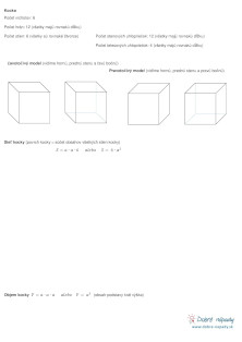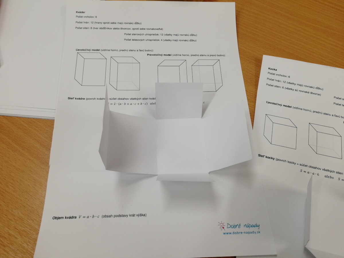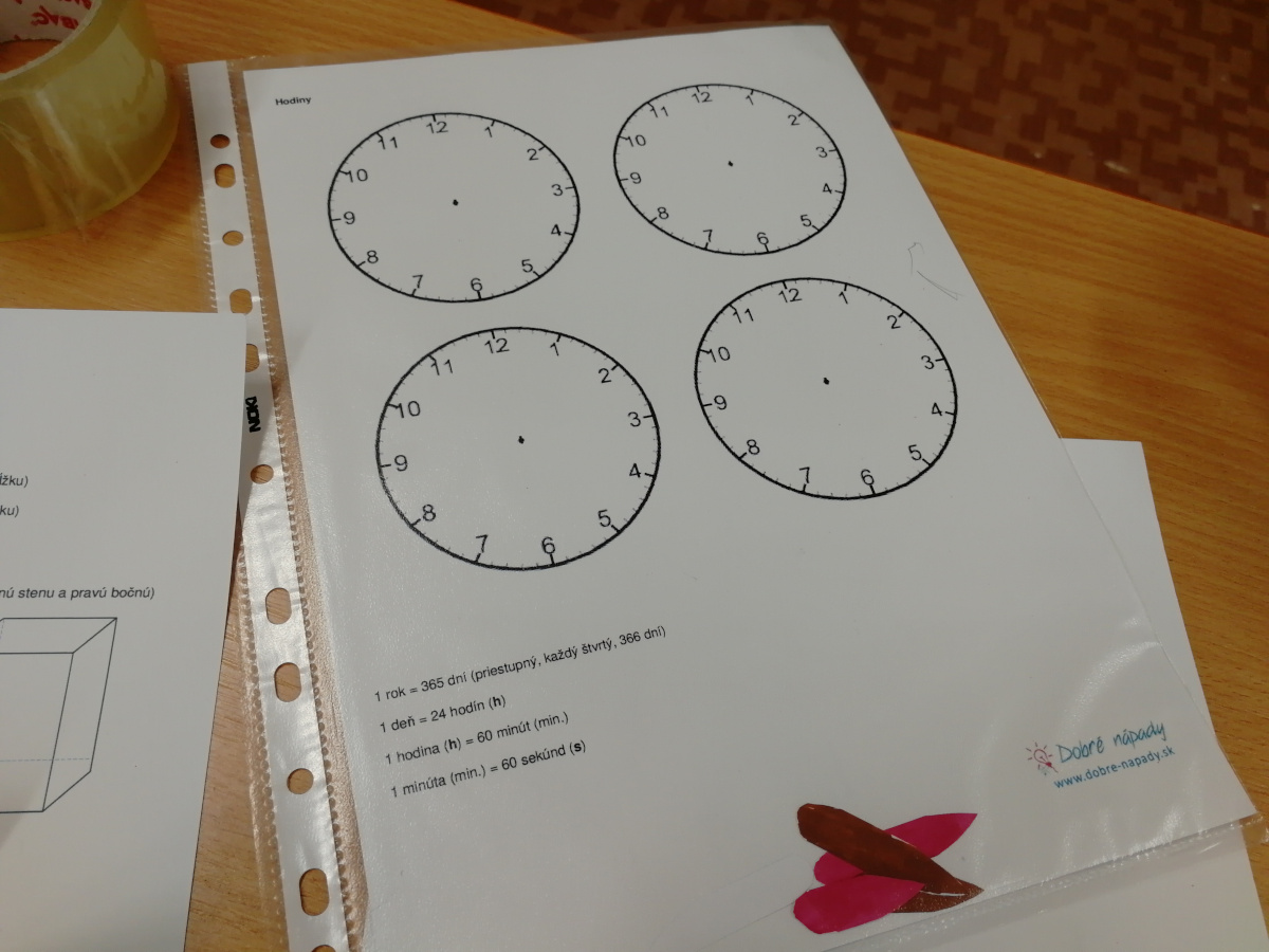 No a tie, kde som chcela prilepiť sieť telesa, som si vytlačila na 100 gramový papier. Len ho dávajte tlačiť po jednom do podávača. Každý pracovný list som zabalila zvlášť do euroobalu a vložila do zakladača. Nakreslila som na výkres šablónu kocky, kvádra a dievčina si vystrihla a nalepila na príslušný list papiera. Jej sa ešte páčilo vymaľovať si steny na pohľadoch na kocku a kváder. Dorobila si doma spolu s mamou čo potrebovala. Vystrihla si aj niekoľko ručičiek a vymaľovala, aby si mohla prikladať k hodinkám.
