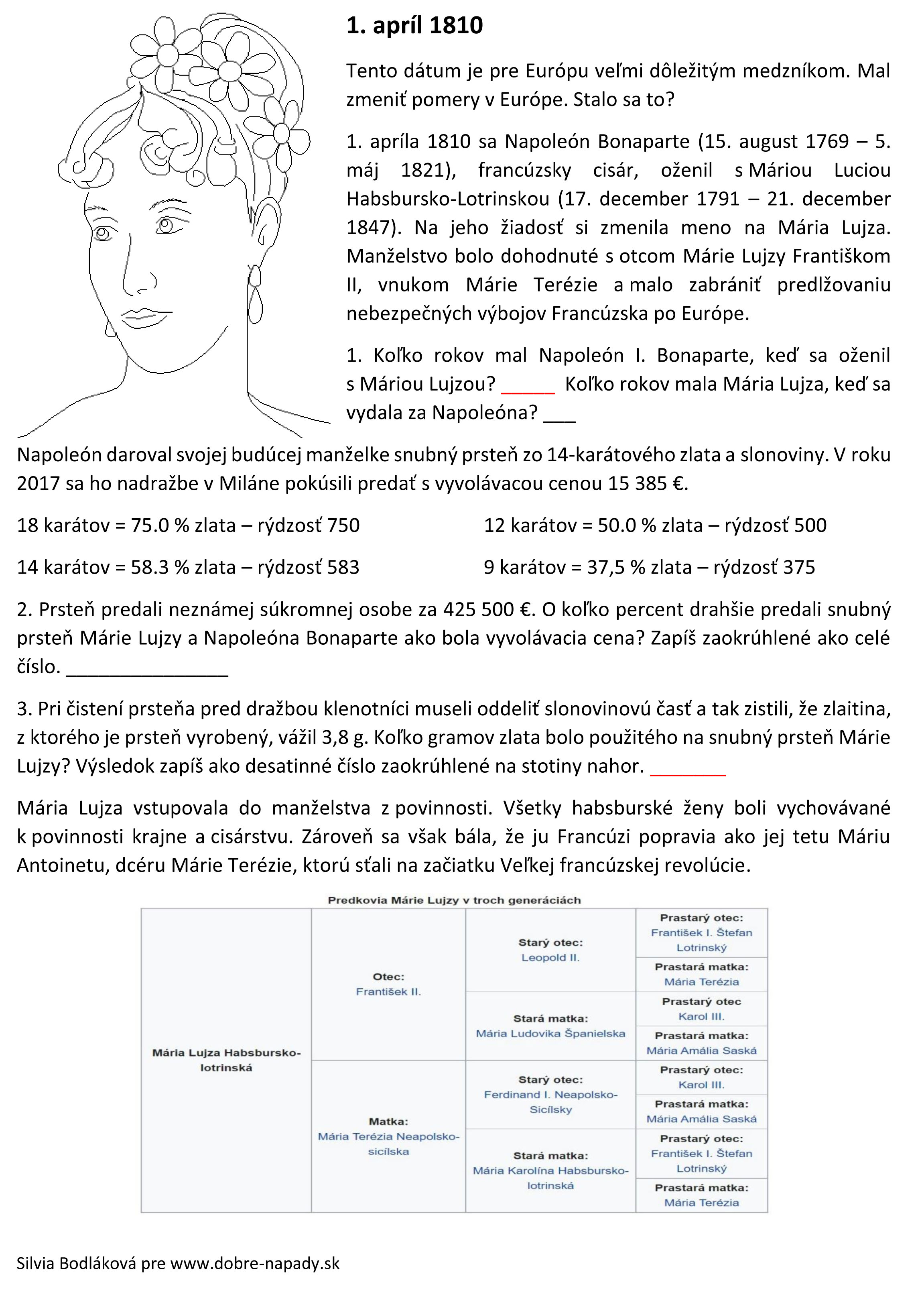 Mám však aj krásne spomienky na riešenie u deviatakov. Všimli si vekový rozdiel medzi manželmi a začali riešiť či ona bola zlatokopka. A ako ich pohoršilo, po štyroch rokoch bolo ich manželstvo anulované či ako sa zachoval vlastný otec k Márii Lujze. Nie, neprešli sme len do dejepisu, aj sme počítali úlohy.