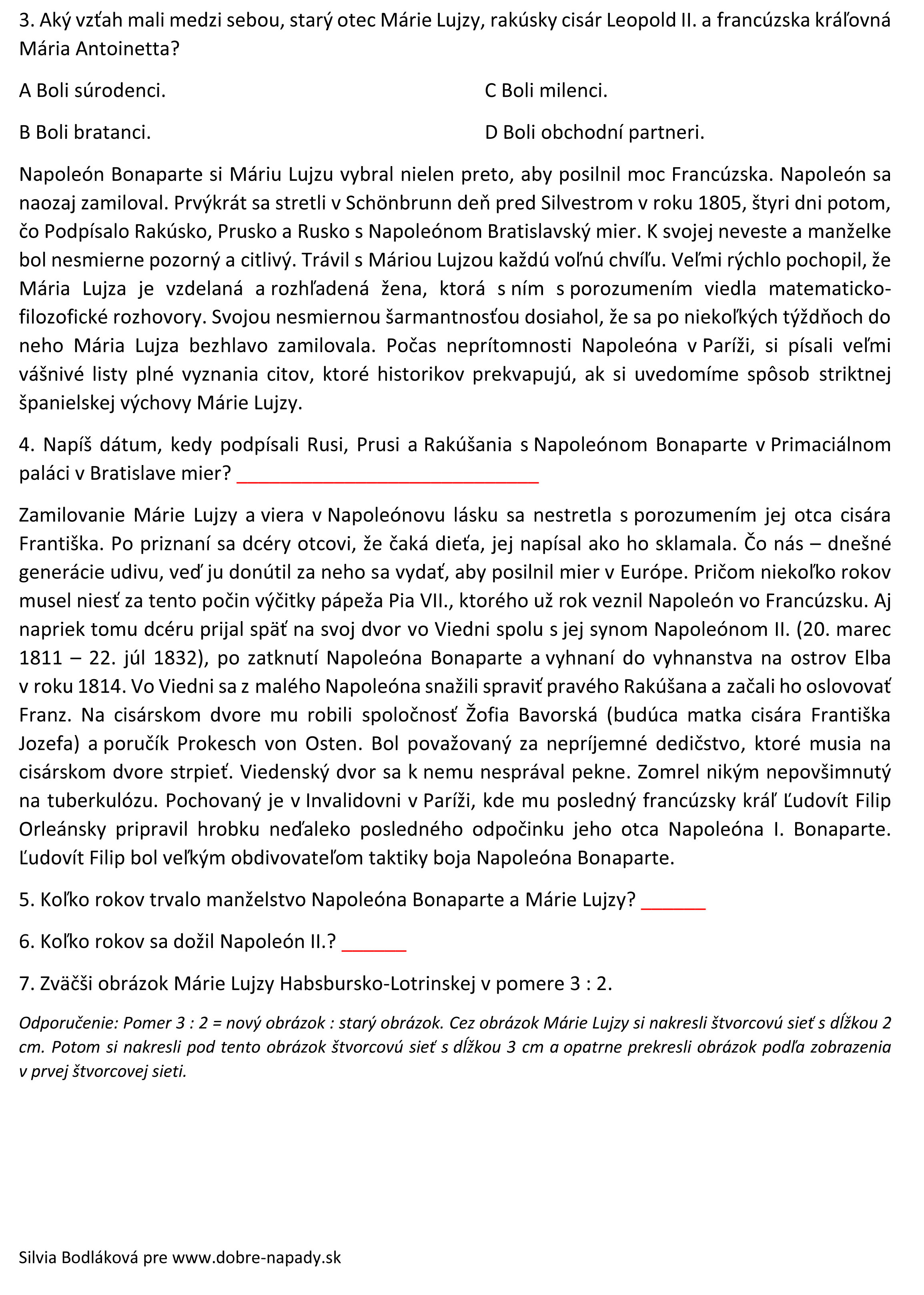 V tento deň sa ženil Napoleón. A tak sme počítali úlohy o jeho manželstve. Napríklad karáty na snubnom prsteni, prepojenie jeho manželky s Máriou Antoanetou, či koľko rokov trvalo ich manželstvo a nakoniec sme zväčšovali v štvorcovej sieti (museli si ju narysovať) portrét Márie Lujze Habsbursko Lotrinskej.