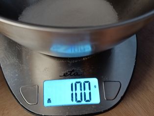 Zomelieme asi 100 g kryštálového cukru na jemnejší, ale nie až práškový. Vsypeme ho do nádoby - my sme použili tú, kde sme mali ešte trocha vanilkového cukru z jari - preto na fotografiách vidíte v nádobe struky. K cukru prisypeme pomletú vanilku - 5 g. Nádobu uzavrieme a poriadne pretrepeme.