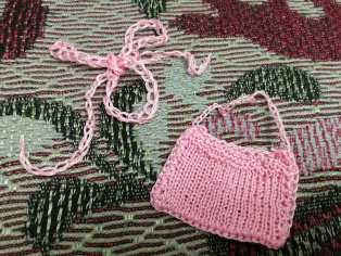 Pletieme ihlicami 1,5. Nahodíme si na ihlicu 20 očiek. Prvých 6 radov upletieme obrátenými očkami, ďalej 40 - 44 radov pletieme lícovým žerzejom a posledných 6 riadkov zase obrátene. Následne prehneme pletenie do tvaru vrecúška a zháčkujeme krátkymi stĺpikmi. Rúčku urobíme z retiazky.