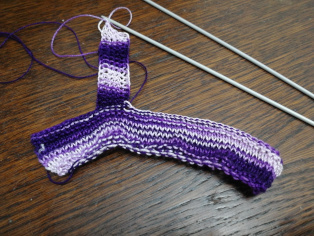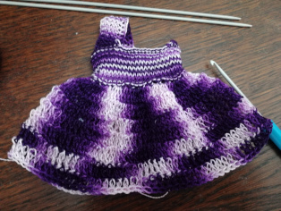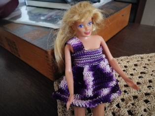 Doma sme zase vytiahli bábiky a začali ich obliekať. Najnovší model sú fialové melírované šaty, na ktorých sme skombinovali pletenie a háčkovanie.