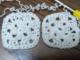 Takto upletieme aj druhý štvorec rovnako ako prvý. Štvorce zháčkujeme krátkymi stĺpikmi a pomocou retiazkových očiek urobíme rúčku.