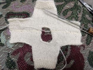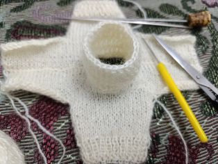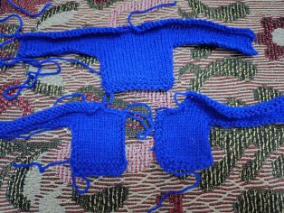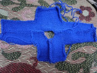 Upletieme diely ihlicami č. 3 prvé štyri rady. Následne pletieme ihlicami č. 3,5. Na fotografií vidíte diely hneď po upletení. Pred zošitím ich radšej prežehlite. Lepšie sa budú zošívať. Po zošití obháčkujeme predné diely a priekrčník jedným radom krátkych stĺpikov háčikom č. 3. Tým trocha vyrovnáme diely a okraj bude krajší. Môžeme prípadne ešte prejsť tento rad stĺpikov ráčikovým stehom.