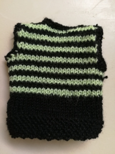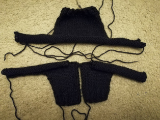 Na ihlicu si nahodíme 26 očiek. Upletieme 6 radov 2 hladko, 2 obrátene, potom pletieme lícovým žerzejom. Vo výške kde chceme, nahodíme na každej strane 16 očiek a upletieme rukávy do výšky 2,5 cm. Pletenie sa dosť točí, preto si pri zošívaní dielov pomôžeme zošpendlením.