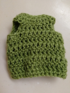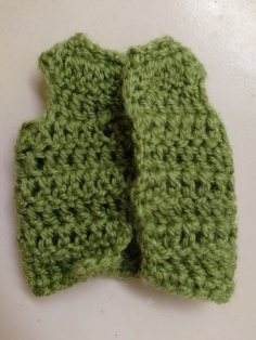 Urobíme si retiazku z 30 očiek Uháčkujeme osem radov dlhými stĺpikmi. Potom si rozdelíme háčkovanie na prvých 6 očiek (2 rady dlhých stĺpikov), 4 očká necháme prázdne, 10 očiek (2 rady dlhých stĺpikov), 4 očká necháme prázdne, 6 očiek (2 rady dlhých stĺpikov). Potom uháčkujeme jeden rad dlhých stĺpikov na ukončenie vesty. Celú vestu obháčkujeme radom krátkych stĺpikov.
