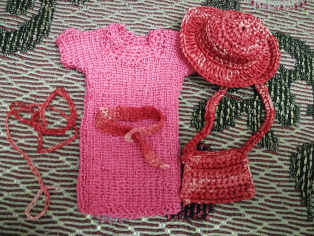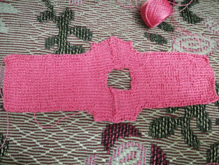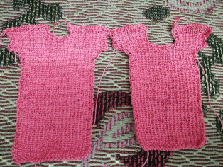 Na ihlicu si nahodíme 38 očiek. Pletieme pružný vzor: hladko-obrátene. Upletieme výšku šiat aká sa nám páči. Na každej strane pridáme v dvoch radoch po jednom očku a následne v ďalších dvoch radoch 4 očká. Výšku rukáva odporúčame na 1,7 cm. Oba diely zošijeme na ramenách. Priekrčník obháčkujeme krátkymi stĺpikmi v 3 - 4 okruhoch. Potom šaty zošijeme aj po bokoch. Rukávy môžeme obháčkovať 1 - 2 okruhmi krátkych stĺpikov alebo ich môžeme "nariasiť" a uháčkovať 1 - 2 okruhy dlhých stĺpikov pričom do každého očka vháčkujeme jeden dlhý stĺpik.