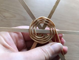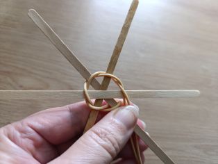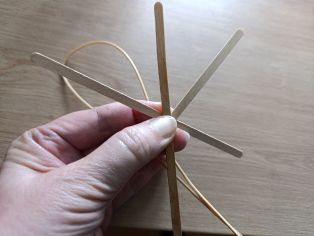 Prehneme pedig na polovicu a omotávame okolo paličiek, ktoré sme si prichytili palcom a ukazovákom do tvaru šesťcípej hviezdy. Pracujeme opratrne, ale rýchlo. Pedig môže rýchlo schnúť v závislosti od prostredia, v ktorom pletiete.