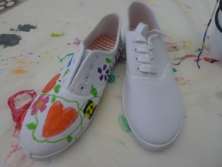 Biele či iné jednofarebné svetlé tenisky si namaľujeme podľa fantázie fixkami na textil. Necháme zaschnúť a opatrne prežehlíme, aby farba lepšie vydržala. My sme najprv tenisku vypchali starými tričkami, aby mala tvar, pokreslili a potom takú vypchatú vyžehlili. Len jednu. Veď kde je napísané, že obe musia byť rovnaké? Jednu sme nechali bielu.
