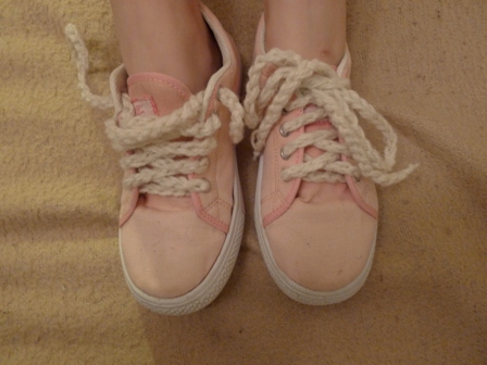 Tenisky nemusíme len farbiť. čo napríklad vtedy, ak po praní sme našli len jednu alebo aj žiadnu šnúrku? Alebo len proste si chceme poznať svoje tenisky v šatni medzi dievčenskými. Nuž, môžeme si aj šnúrky uháčkovať.