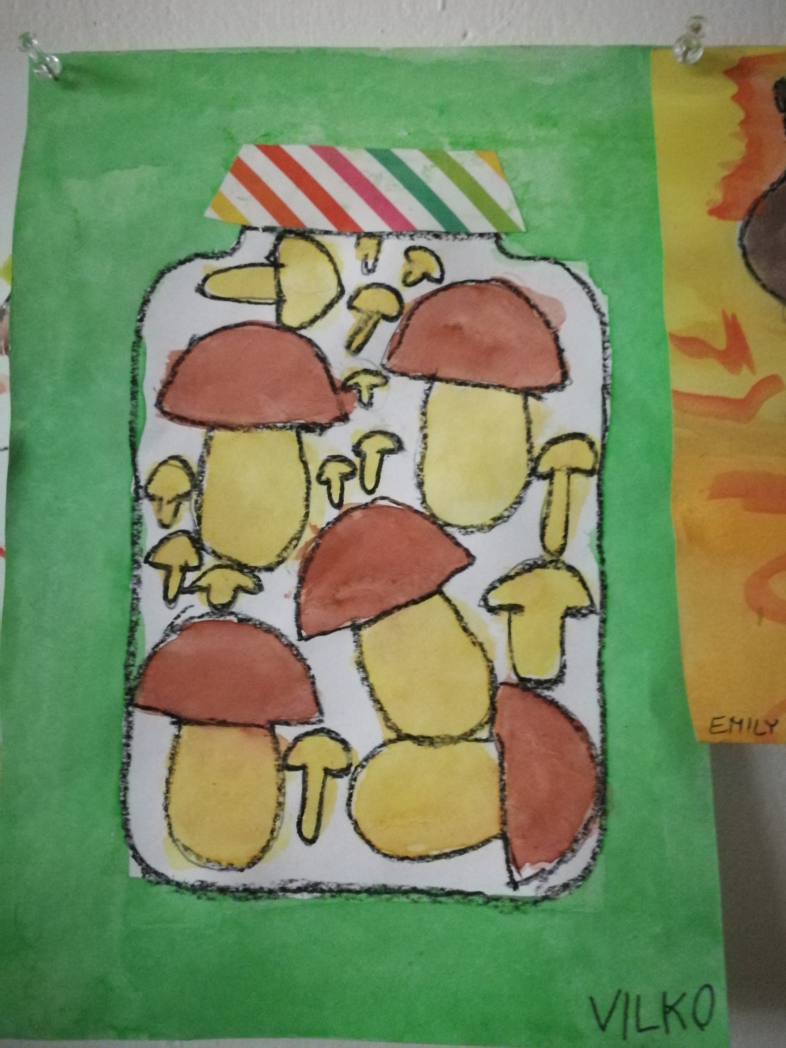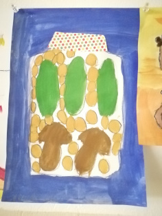 Konzervovať môžeme aj s menšími deťmi na papieri. Predkreslíme im veľký pohár a do neho hríby, uhorky, hrášok... čo majú radi alebo sa im páči. Potom ich necháme vymaľovať tenkým plochým štetcom vodovými farbami.