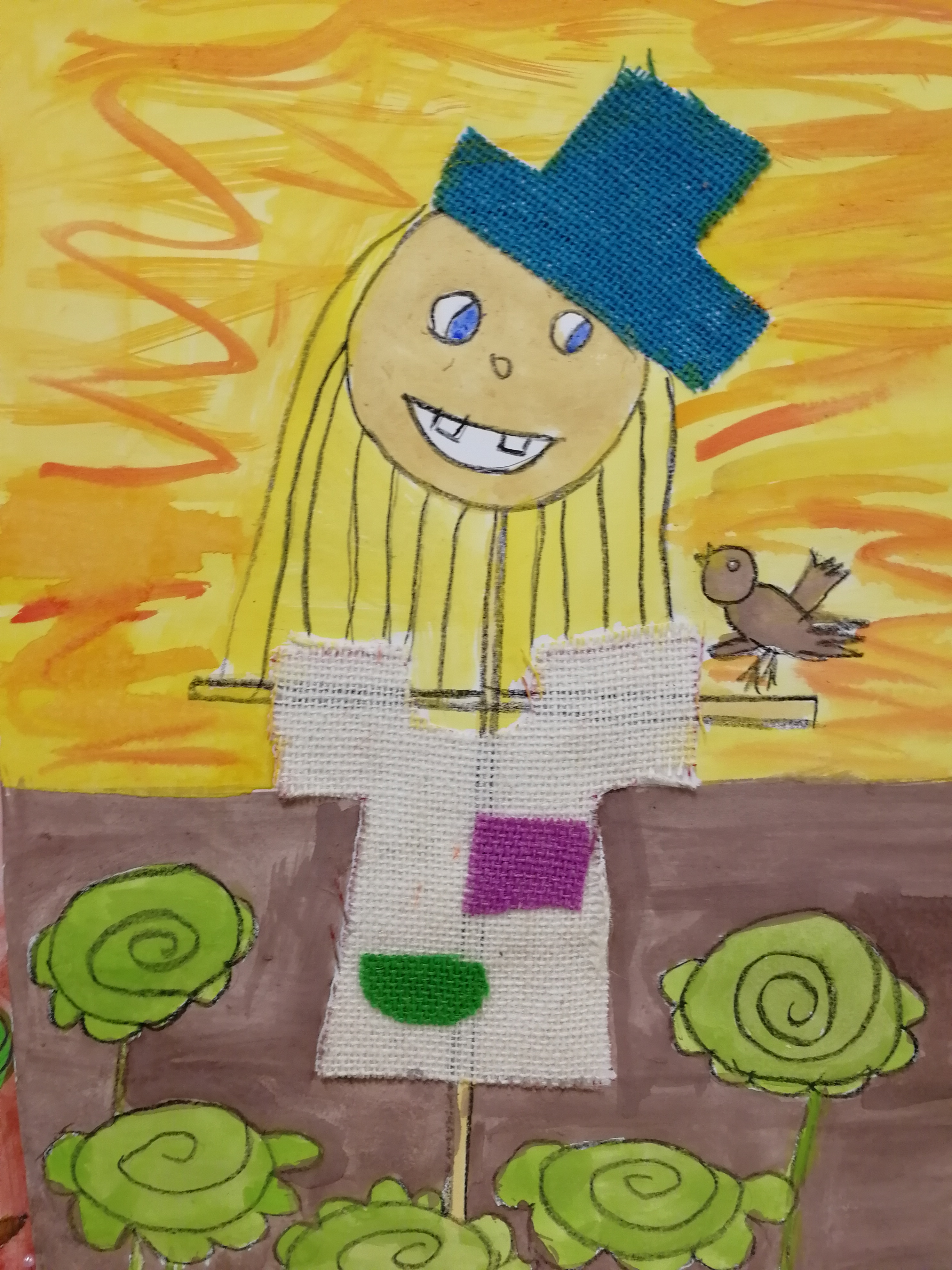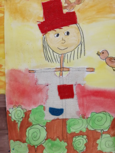 Pri maľovaní vodovými farbami zostaneme. Pre vývoj jemnej motoriky dieťaťa je toto maľovanie veľmi dôležité. Predkreslíme dieťaťu strašiaka, ktorého vymaľuje. Po zashnutí farieb mu prilepíme z odstrižkov látky urobený kabát alebo aj vlasy, môžeme aj trávu či kapustu...