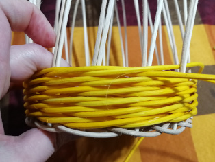 Pripravíme si mokré tri dlhé žlté prúty a začneme obpletať osnovu. V treťom okruhu z pravej strany vpichneme ku každému osnovnému prútu ešte jeden suchý. Košík namočíme a pokračujeme v obpletaní bokov košíka. Pridaním ďalšieho prútu v osnove spevníme boky košíka.