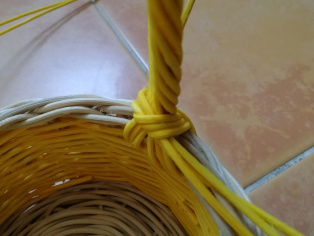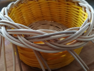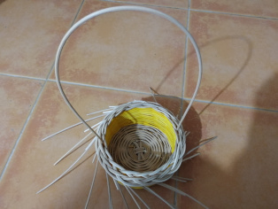 Do košíka zapichneme pedig hrúbky 4,5 mm. Dĺžku si vyberieme podľa seba. Potom ju začneme obpletať tromi dlhými žltými prútmi z každej strany.