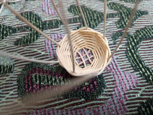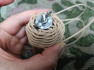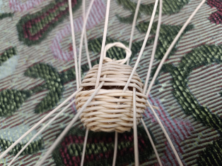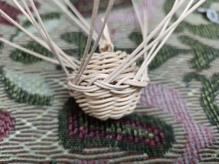 Na jeden košíček zauzlíme očko., aby sme neskôr mohli zavesiť na stromček. Potom pospájame oba "košíčky".