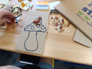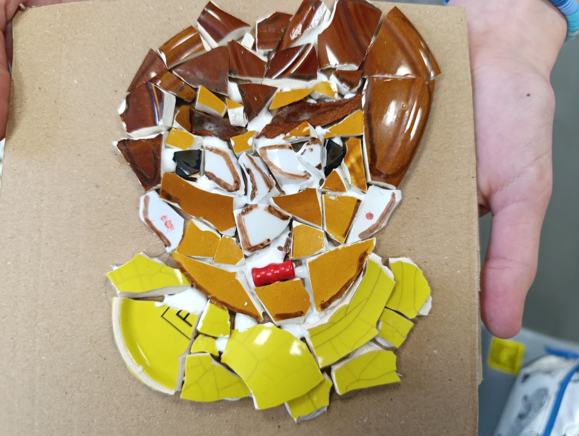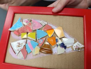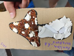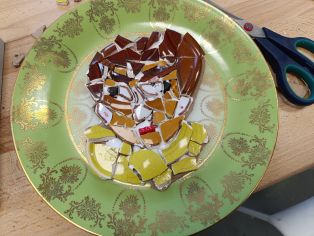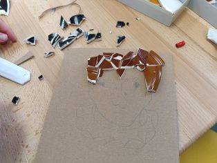 Pospájame ich lepidlom Herkules, tavnou pištoľou, lepiacimi páskami, gumičkami či starými šnúrkami z topánok. Najprv si na kartón nakreslíme ceruzkou alebo fixkou väčší obraz, či len čiary - niečo ako maľovánku. Nalámeme si kúsky keramiky, vyskúšame si ich poukladať na miesta. Keď už sme s návrhom spokojný, začneme kúsky priliepať.