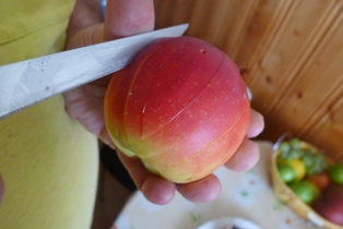 Červené veľké zimné jablko krájame nožom na zeleninu. Jablko nakrojíme približne 1 cm do hĺbky. Potom asi 1 cm po každej strane narežeme hlbšie a nakoniec o 1 cm ďalej prekrojíme až do stredu.