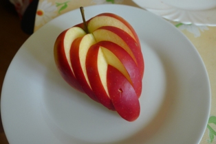 Jablko položíme na tanier a posunieme vyrezanú časť. Takto dekorujeme ovocné šaláty alebo pečenú kačicu a pečené prasa.