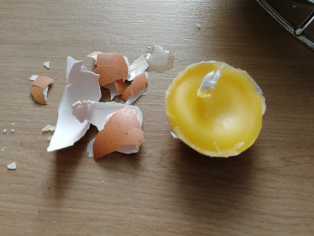 Budeme potrebovať žltý a biely vosk, knôt hrúbky na sviečku s priemerom 3,5 - 5 cm, formičky na pečenie v tvare vajíčka a vajíčkové škrupiny.