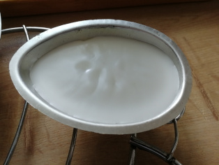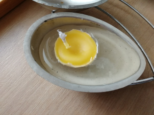 Žltý vosk rozpustíme nad parou. Vlejeme ho do škrupinky okolo knôtu. Necháme vytvrdnúť. Po zatvrdnutí, ošúpeme z vosku škrupinku. Do formičky vlejeme biely vosk, do ktorého vložíme žltú sviečočku a necháme celé zatvrdnúť.