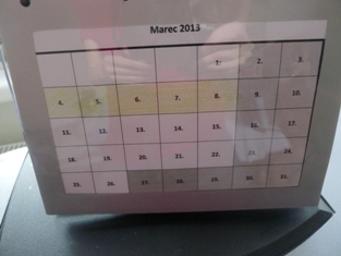 Stojan je z Ikea. Odmeriame veľkosť rámiku v centimetroch, potom aj priesvitnej časti. Vo Word-e si urobíme okienko tabuľky s rozmermi vonkajšieho rámika a do nej vložíme na stred tabuľku s rozmermi priesvitného rámika. Do vnútornej tabuľky potom vpíšeme mesiac a rok a pod neho vložíme tabuľku, do ktorej vpíšeme čísla - dátumy a ak zvládame aj mená. Ak robíme kalendár so staršími deťmi, môžeme sa zahrať aj vyfarbovaním buniek podľa sviatkov, víkendov ... Či možno doplniť polopriesvitné písmená dní, ktoré sa v týždni prekrývajú z predošlého mesiaca alebo s nasledujúcim mesiacom. Potom vytlačíme, vystrihneme a vložíme do obalu.