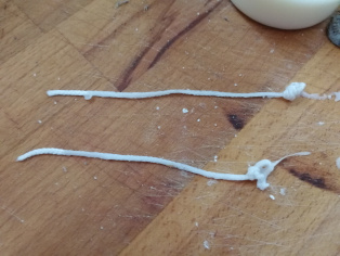 Na novú verziu budeme potrebovať poháriky od jogurtov, vosk, ktorý zostal zo starších sviečok, knoty na hrúbku asi 3 - 5 cm a levanduľové semiačka.