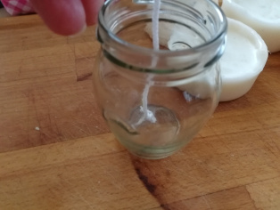 Levanduľu rozomelieme na drobno a nasypeme trocha na spodok pohárikov. Nad parou roztopíme vosk, do ktorého namočíme knoty, ktoré sa tak stanú pevnejšími a lepšie sa nám bude zalievať sviečka. Do vosku vmiešame trocha levandule. Postupne zalievame poháriky.