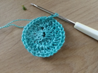 V uzavretom okruhu urobíme 5 retiazkových očiek. nie v nasledujúcom, ale v ďalšom očku urobíme dlhý stĺpik. Pokračujeme jedným retiazkovým očkom a v druhom (ob očko) urobíme dlhý stĺpik. Celý okruh urobíme takto a uzavrieme ho pevným okom.