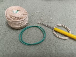 - Okruh uháčkujeme len stĺpiky. Neháčkujeme ich veľmi husto. Nesnažíme sa gumičku naťahovať. Na konci okruh spojíme pevným okom, v ktorom urobíme 4 retiazkové očká. Otočíme háčkovanie dolu hlavou.