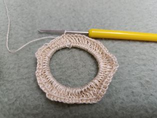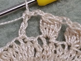 - V jednom retiazkovom očku z predošlého okruhu urobíme 6 stĺpikov, nad stĺpikmi z predošlého okruhu urobíme 2 retiazkové očká. Takto háčkujeme celý okruh, ktorý ukončíme pevným okom.