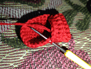 Uháčkujeme si retiazku z 12 očiek. Otočíme si háčkovanie a vpichneme do druhého očka. Dokončíme riadok krátkymi stĺpikmi. Na poslednom očku si nadhodíme jedno retiazkové očko, otočíme pletenie. Vpichneme do rovnakého očka, z ktorého vychádza retiazkové očko. Potom dopletieme do konca riadka a zase si nadhodíme jedno retiazkové očko. Uháčkujeme 5 alebo 6 radov.