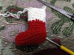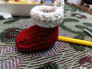 Následne prišijeme prednú časť topánky. Potom už háčkujeme okruhy len okolo časti topánky, ktorá by mala smerovať od členka hore. Po niekoľkých okruhoch zmeníme farbu. Bielu časť vyhneme smerom von a doháčkujeme uško na zavesenie.