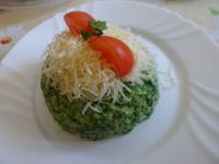Na roztopenom masle si speníme na drobno nakrájanú cibuľku. Pridáme polovicu na jemno posekaného cesnaku. Zalejeme mliekom. Osolíme a okoreníme. Pridáme rozpustený špenátový pretlak. Premiešame. Necháme prevrieť. Vmiešame ryžu. Pridáme zvyšok pretretého cesnaku. Premiešame. Pridáme polovicu na jemno nastrúhaného syra. Chvíľu podusíme, kým nám nestune. Dochutíme zase soľou a korením.