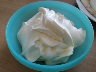250 g jemného tvarohu, 4 balíčky vanilkového cukru, 150 ml šľahačky, 100 ml kyslej smotany
