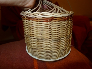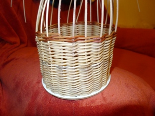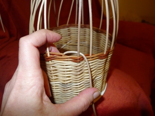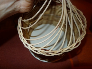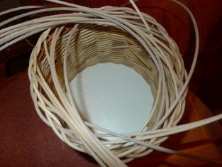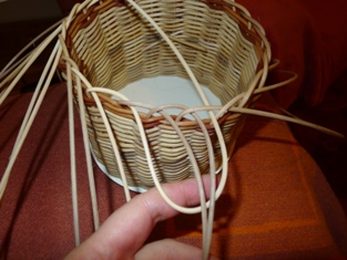 Po obtočení celého okruhu máme prúty trčiace von z košíka - ako slniečko. Začneme obtáčať osnovné prúty odspodu - prevlečieme prút ob jeden do oka druhého prútu. Teraz prúty trčia smerom do vnútra.