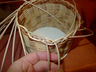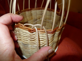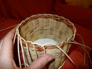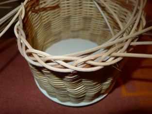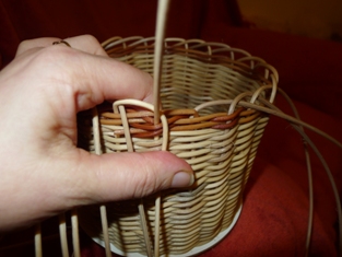 Obtáčame osnovné prúty okolo susedného. Obtáčame jemne a citlivo. Dávame pozor, aby sme mali prúty dostatočne vlhké. A keď prejdeme celý okruh, posledný prút prevlečieme cez prvé oko - z prvého prútu.