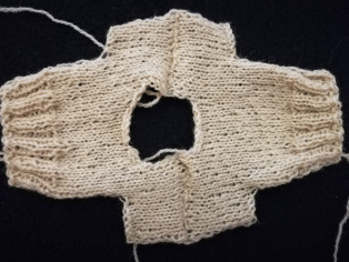V strede ukončíme 6 očiek pletenie rozdelíme na dve časti, ktoré ukončíme zrkadlovo. Od stredu v prvom rade po rozdelení uzavrieme 2 očká a v druhom rade zase 2 očká. Upletieme 4 rady. Stále pletieme lícovú stranu hladko a rubovú obrátene. Druhú stranu ukončíme zrkadlovo s prvou.