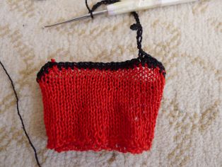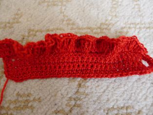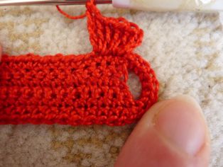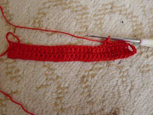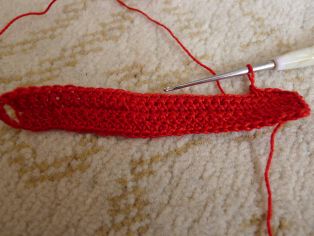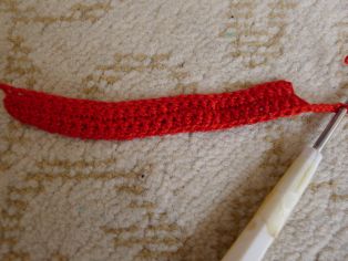 Na začiatku urobíme retiazku z 30 očiek. Na touto retiazkou urobíme štyri rady krátkych stĺpikov. Na konci štvrtého radu urobíme retiazku zo šietich očiek, ktorá má neskôr predstavovať gombíkovú dierku. Pokračujeme krátkymi stĺpikmi dookola celého pásu. Na retiazke urobíme osem krátkych stĺpikov.