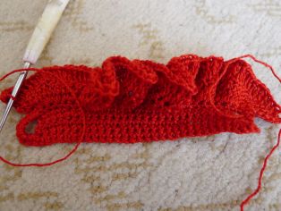 V novom riadku začneme dlhými stĺpikmi vytvárať sukňu. V každom očku urobíme dva dlhé stĺpiky. Po otočení háčkovania, urobíme v prvom očku jeden dlhý stĺpik, v druhom dva dlhé stĺpiky...