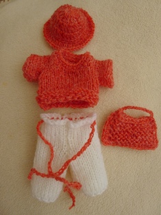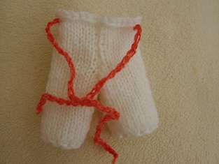Diel nohavíc začneme pliesť na 22 očiek a pletieme lícovým žerzejom asi 14 radov - podľa toho akú dĺžku nohavíc chceme. V 15-tom a 16-tom rade na každej strane uzavrieme po dve očká. ďalej upletieme lícovým žerzejom 10 radov. Uzavrieme pletenie.