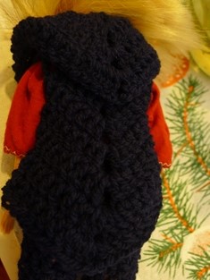 Vestu háčkujeme polodlhými stĺpikmi do kruhu. Najprv si urobíme 4 retiazkové očká, ktoré uzavrieme do kruhu. V prvom okruhu urobíme najprv dva stĺpiky, potom 2 retiazkové očká, 2 stĺpiky, 2 retiazkové očká, 2 stĺpiky, 2 retiazkové očká, 2 stĺpiky, 2 retiazkové očká a ukončíme stiahnutím pevným okom. V ďalšom okruhu urobíme nad stĺpikmi stĺpiky a v retiazkových očkách 2 stĺpiky, 2 retiazkové očká, 2 stĺpiky. Celý okruh stiahneme pevným okom. V nasledujúcom okruhu urobíme otvory na ruky. Nad stĺpikmi urobíme stĺpiky. Nad protiľahlými dvomi retiazkovými očkami urobíme 6 retiazkových očiek. A nad druhou protiľahlou dvojicou urobíme ako v predošlom rade 2 stĺpiky, 2 retiazkové očká, 2 stĺpiky. V ďalšom okruhu robíme stĺpiky nad stĺpikmi. V šiestich retiazkových očkách urobíme 8 polodlhých stĺpikov.