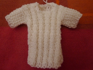 Šaty začneme pliesť na 24 očiek. Po upletení 7 alebo 8 osmičiek, nahodíme na každej strane 7 očiek, ktoré budú predstavovať rukávy. Rukávy pletieme obrátenými očkami na lícovej a rubovej strane. Takto upletieme 12 radov a pletenie na zadnom diely uzavrieme.