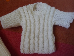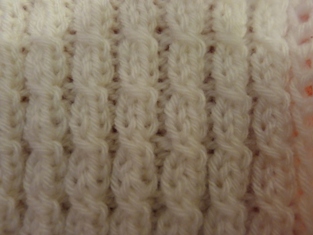 Pri pletení použijemei vzorku - malé osmičky. Upletieme dva rady po dve očká hladko a dve očká obrátene. V treťom rade očká, ktoré sa javia obrátene, upletieme obrátene a očká, čo sa javia hladko upletieme ako osmičku- najprv hladko druhé, potom hladko prvé.